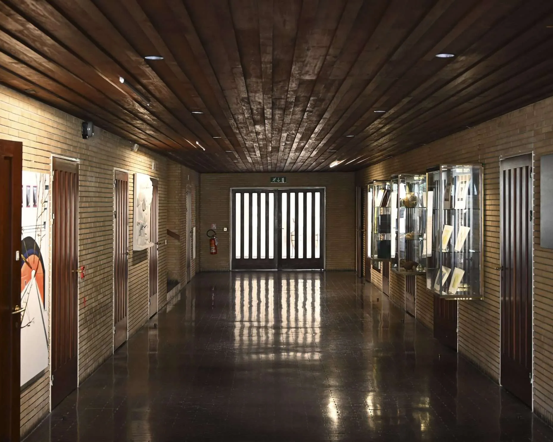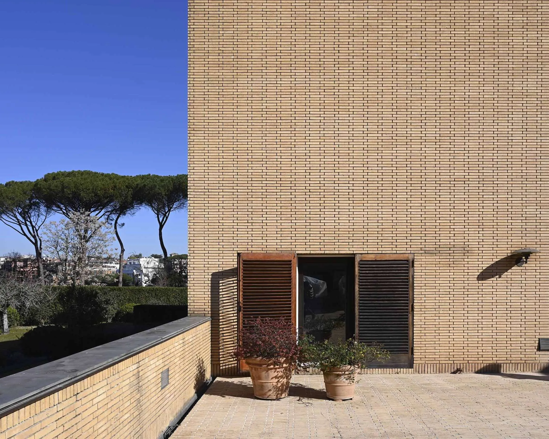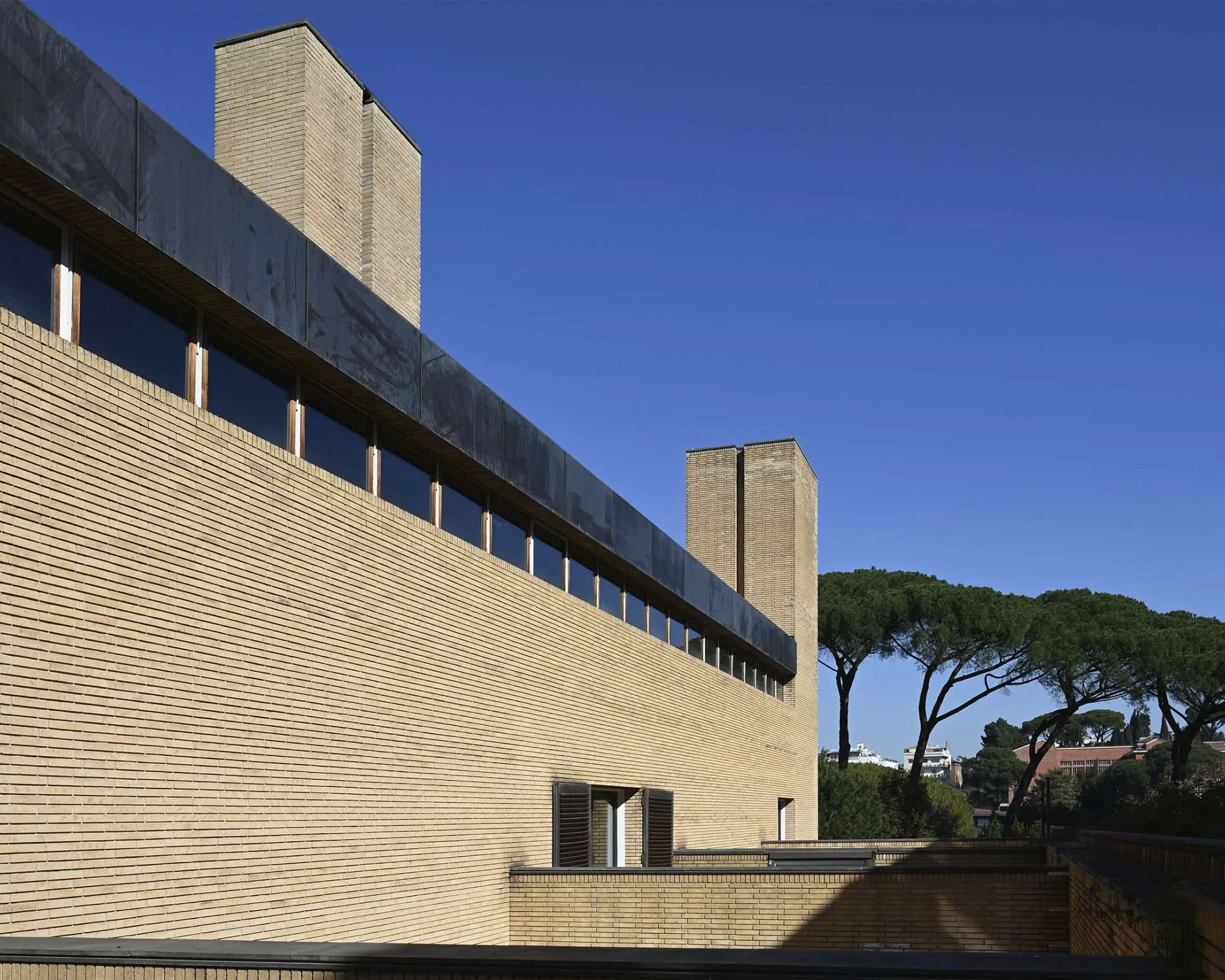 La sede dell’Accademia sorge nel 1967 su progetto dell’architetto danese Kay Fisker, in seguito alla donazione della Fondazione Carlsberg del terreno nei pressi di Villa Borghese. L’edificio coniuga mattoni gialli, legno teak, grandi superfici vetrate e richiami all’architettura romana, come il vestibolo con atrio che accoglie la scultura Aurora Septentrionalis. Un luogo pensato per favorire il silenzio, la concentrazione e la luce naturale, che fonde razionalismo e calore, misura e accoglienza.
